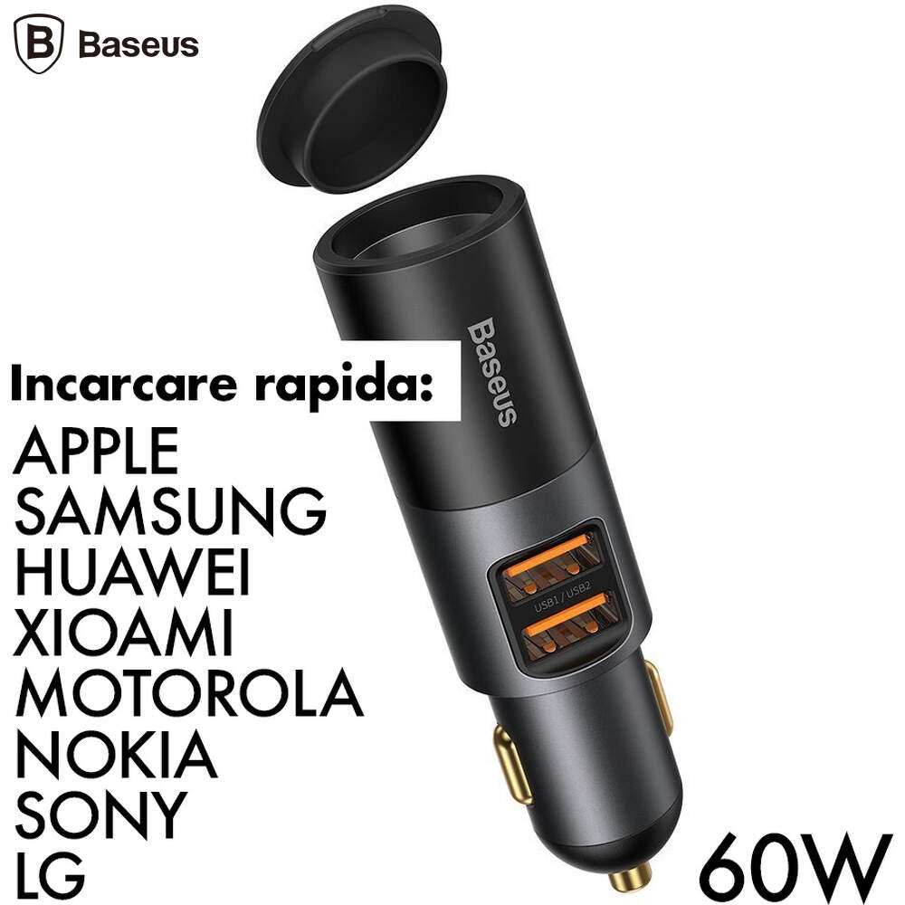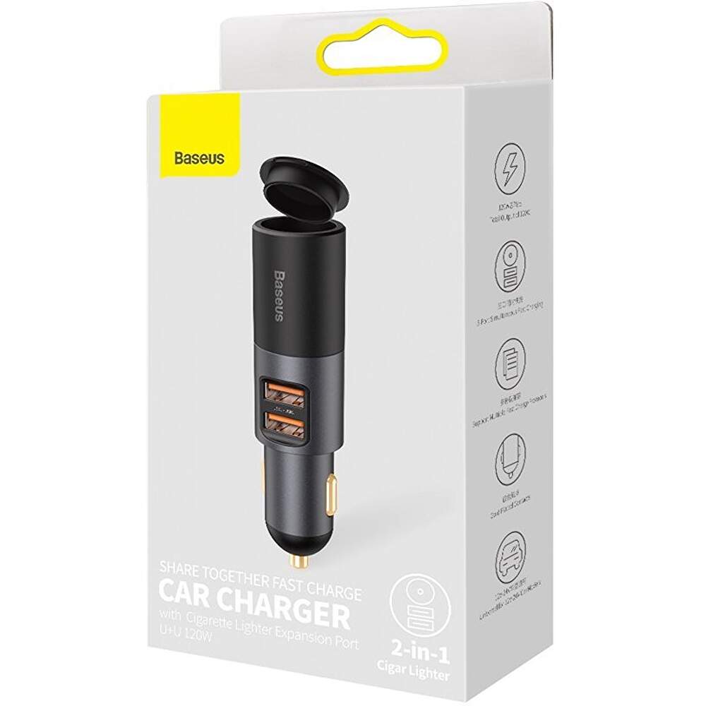 Incarcator auto, Baseus Share Together, CCBT-D0G, 2 porturi, 2xUSB, Cu port de expansiune pentru bricheta, 120W, Quick Charge, Negru